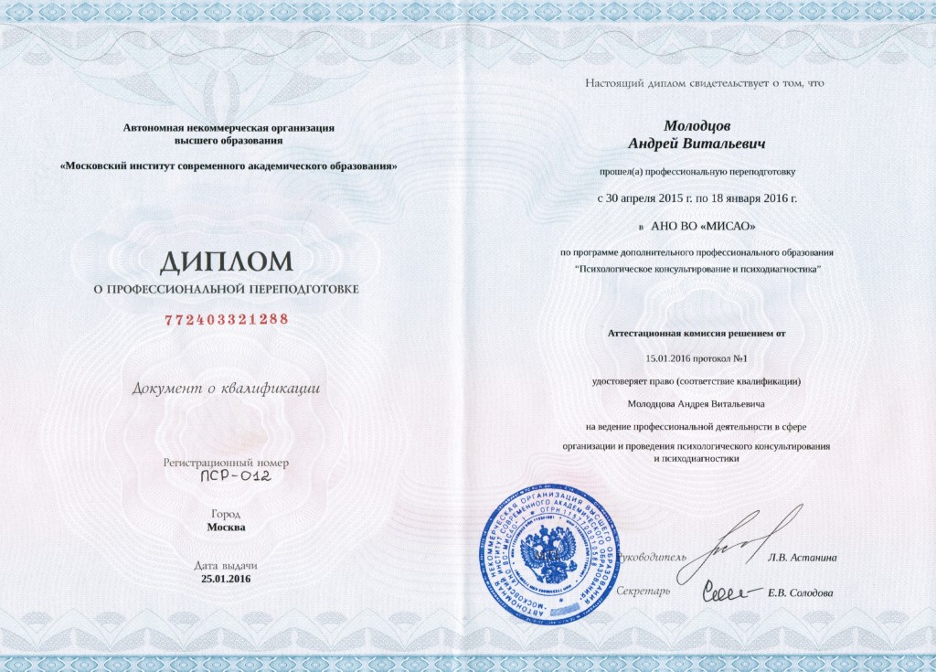 Первое высшее психологическое образование. Абитуриент сдает вступительные испытания, заключает с учебным заведением двусторонний договор, оплачивает образовательные услуги и приступает к учебе. По окончанию обучения выпускник получает диплом установленного образца или гос. образца, если образовательное учреждение имеет государственную аккредитацию.