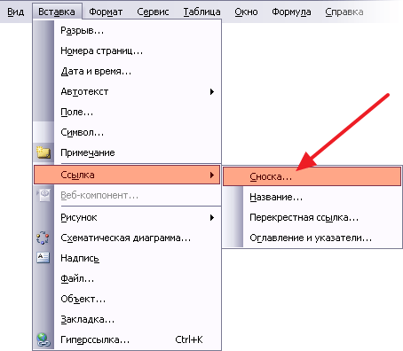 Для Word 2003 схема того, как делать сноски в курсовой работе будет немного другая:
