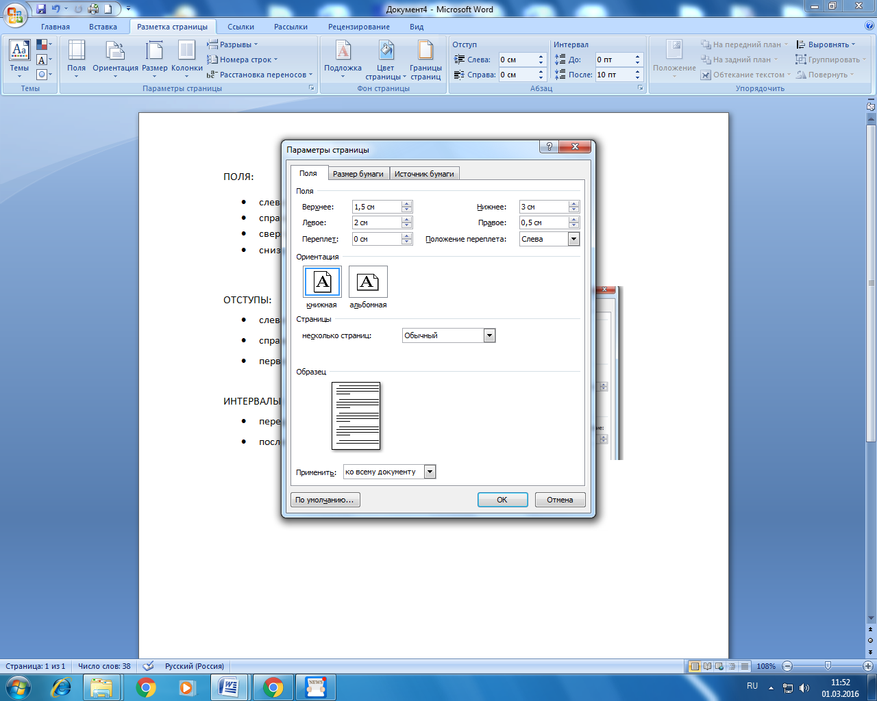 размер нижнего и верхнего полей – 20 мм, слева – 30 мм, справа – 10 мм.