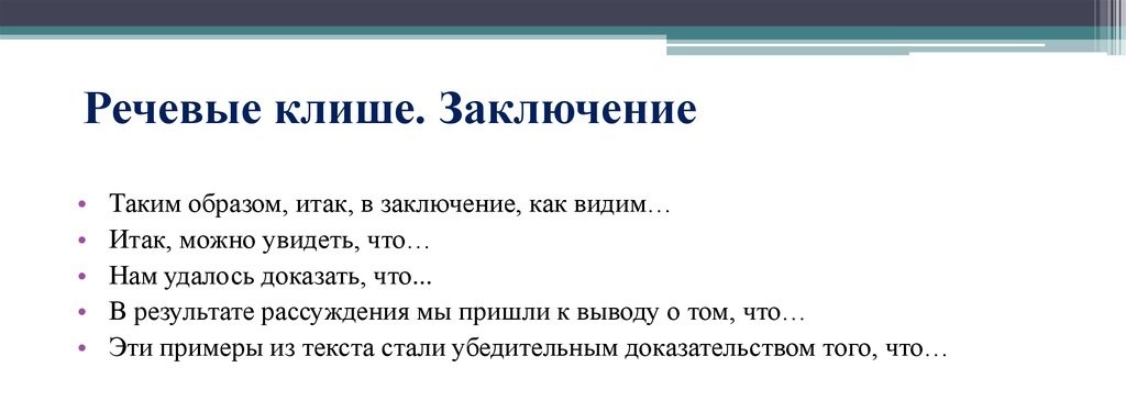 Все выводы должны быть сделаны самостоятельно, быть интересными и познавательными, иметь практическую значимость. Поэтому у многих студентов возникают трудности с тем, как начать заключение в курсовой работе. Для облегчения задачи стоит обратиться к готовым фразам и клише: