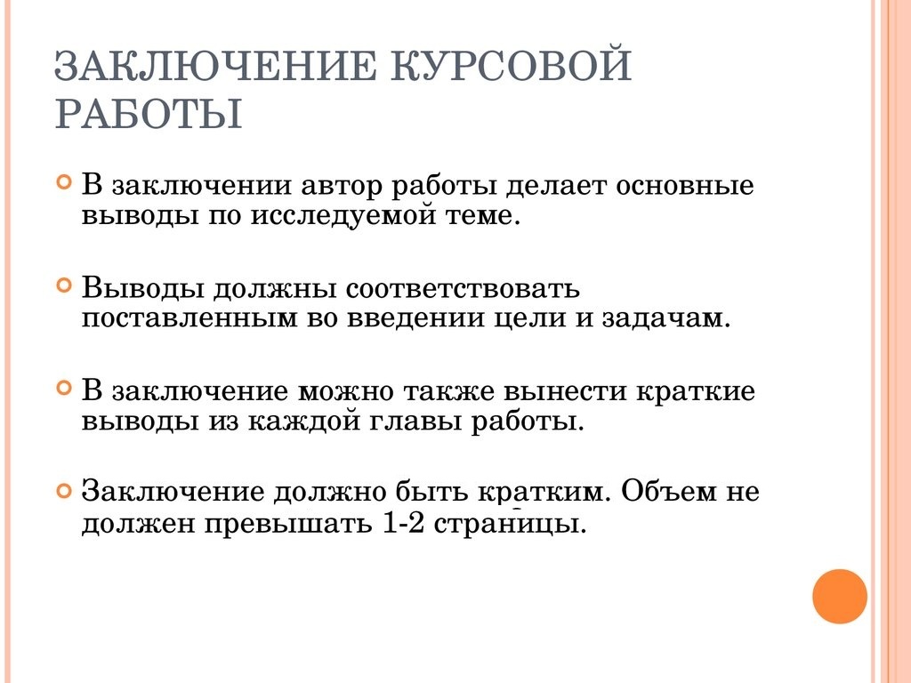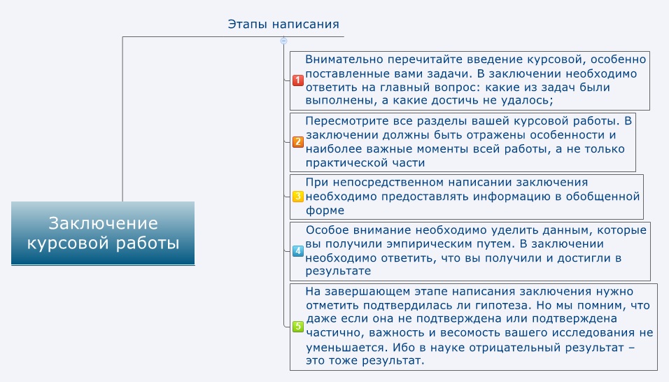 Хорошее заключение курсовой работы содержит этапы проведения исследования. Необходимо в краткой форме рассказать о теоретической части и коснуться практического раздела. Приведенный в этой части учебный материал важно сопровождать личными выводами.