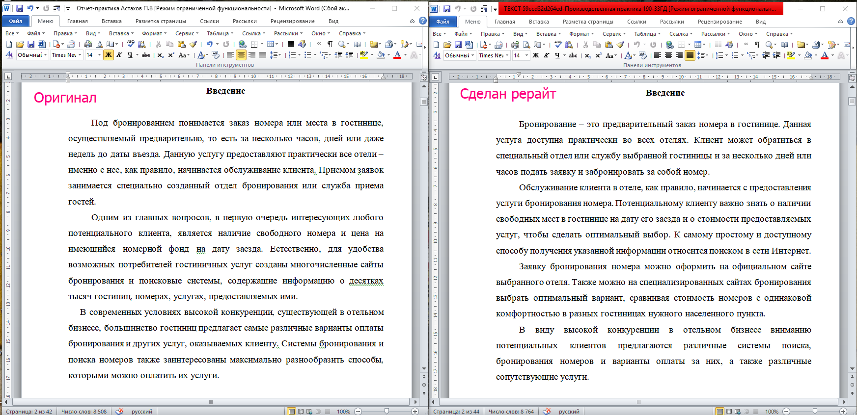 Глубокий рерайтинг требует достаточного погружения в исследуемую тему. Придется поискать дополнительные источники, выбрать из прочитанного информацию, соответствующую теме, и изложить ее в соответствии с заданной структурой, по возможности добавив свой взгляд на изучаемый вопрос. Такая обработка текста уже не многим отличается от написания авторской научной работы. Но этот кропотливый труд оценивается по достоинству. Еще ни одна технология не позволяет определить глубокий рерайт текста. Переосмысление и изложение материала в собственной стилистике уже является продуктом творческой деятельности студента, качество которого оценить может только научный руководитель.