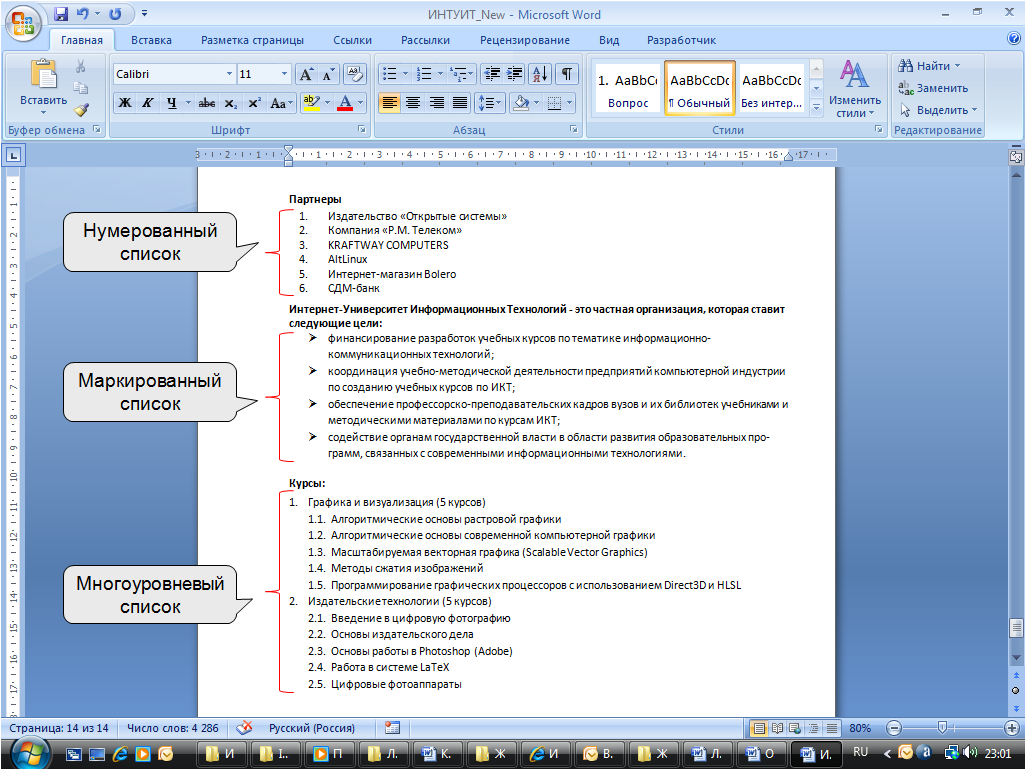 Использование маркированных и нумерованных списков в дипломе