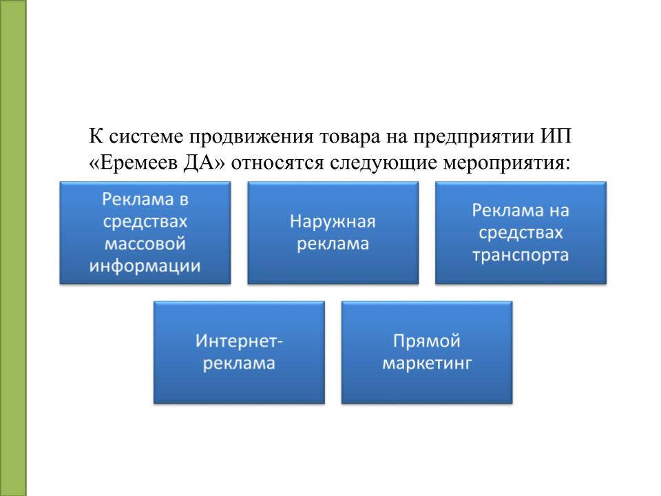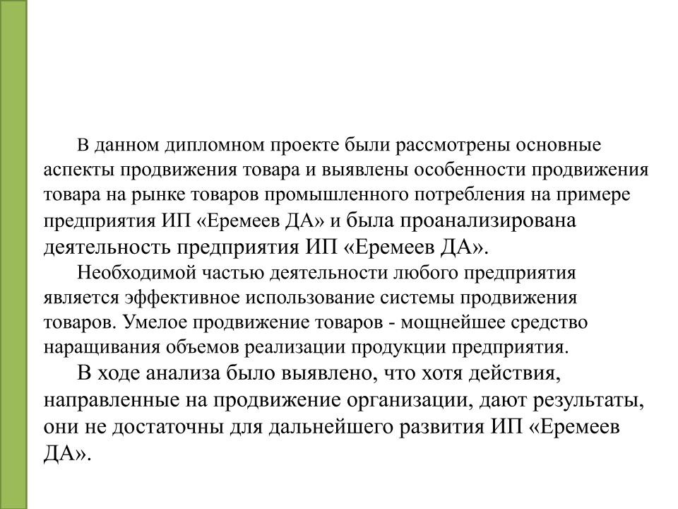 Не всегда теоретический материал помогает понять, как должно выглядеть представление диплома. Отличным примером служит образец презентации дипломной работы на тему: “Реализация продукции при помощи различных средств коммуникации”.