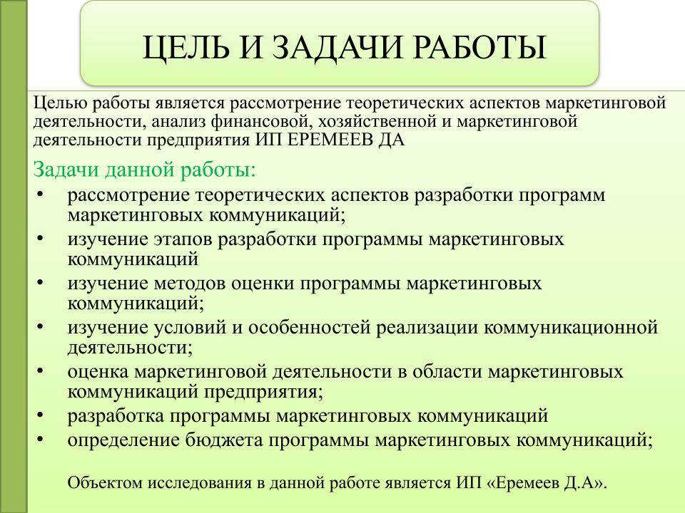 После аргументов указывается предмет и объект исследований. Рассказывается о том, какие цели были поставлены в данной дипломной работе, какие задачи необходимо решить.