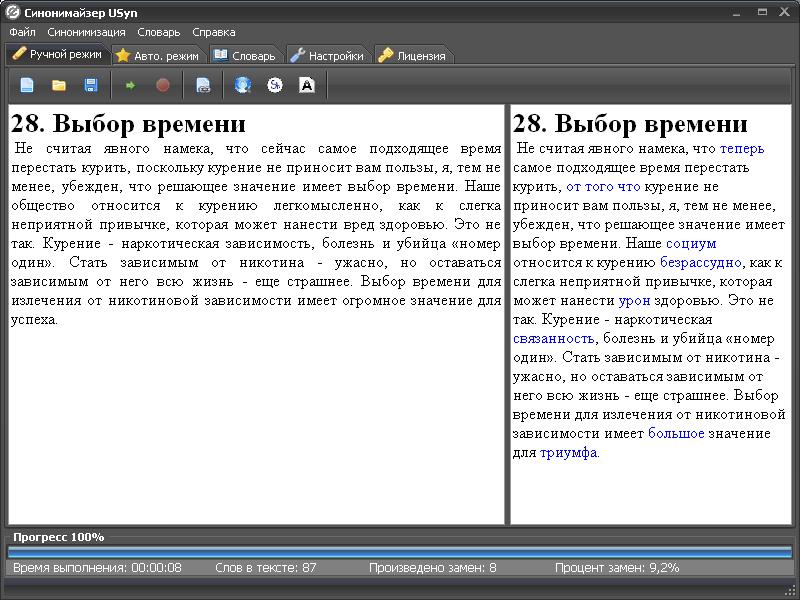 Избежать большого количества повторов поможет специальная программа – синонимайзер. Здесь все просто: находим в интернете ресурс, вставляем текст в открывшееся окно, запускаем обработку. Он должен изменить слова на синонимы, через 3-5 секунд будет результат. Теперь осталось только проверить ошибки и можно идти сдавать. Но здесь нужно быть внимательным, поскольку программа делает много опечаток, часто подбирает слова не подходящие по смыслу.